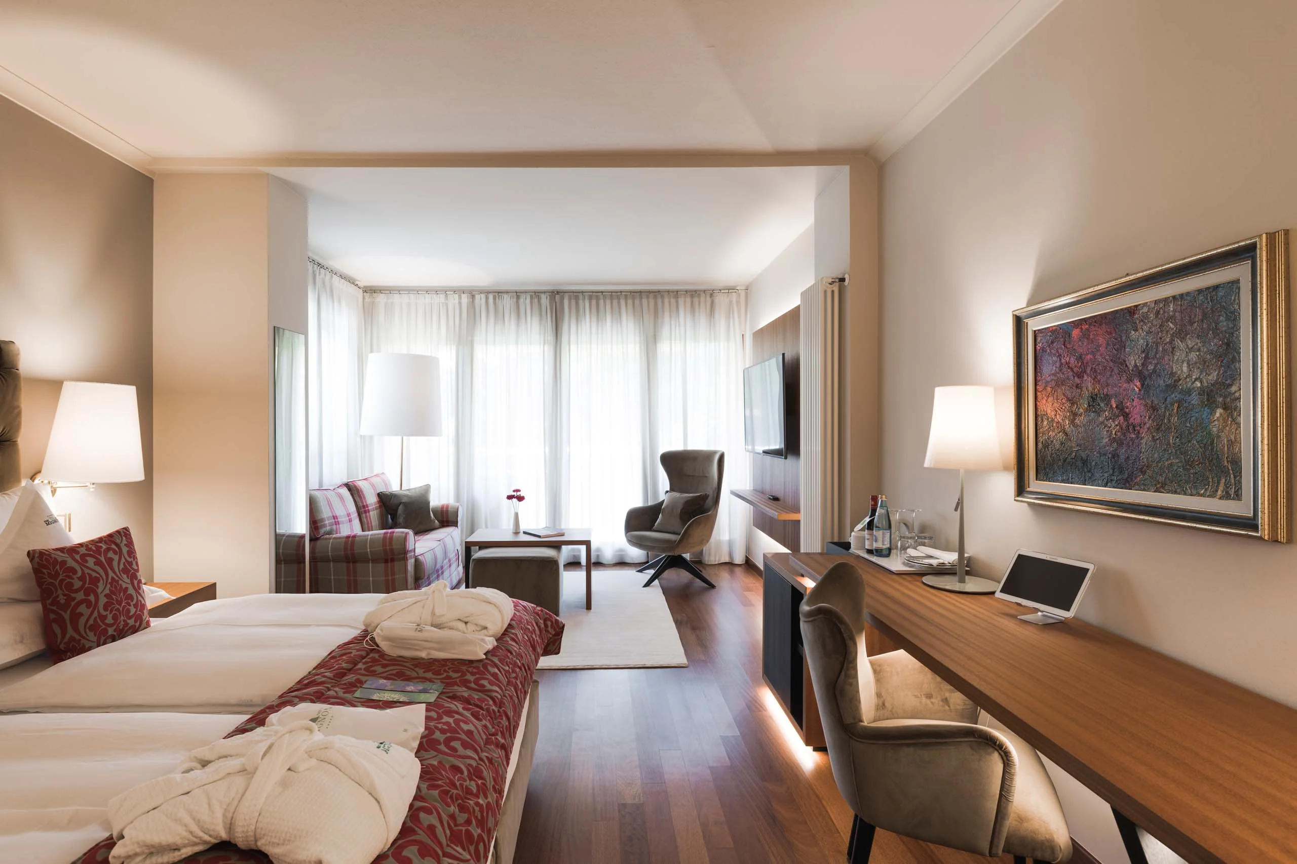 A little more is all that you need. More space, more sun, more peace and more tranquility. Sunny junior suite with lounge-bed, cozy living area and a view of the park, splendid balcony and large bathroom with double sink.